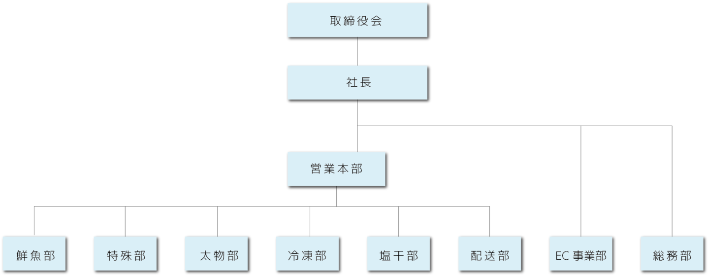 | 事業内容 | 生鮮魚類・冷凍魚介類・塩干魚介類等・魚類全般および水産加工食品の卸売販売 |